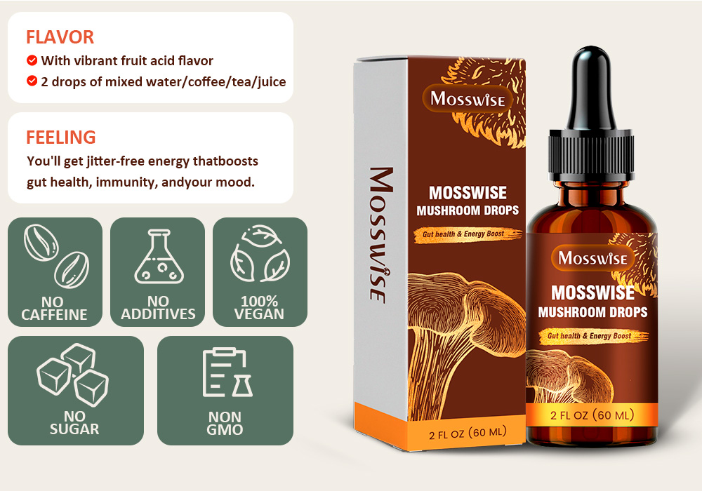 Mosswise Mushroom Drops blend six super mushrooms' polysaccharides, triterpenoids, and neuroprotective compounds to boost immunity, energy, cognition, and antioxidants for overall wellness.